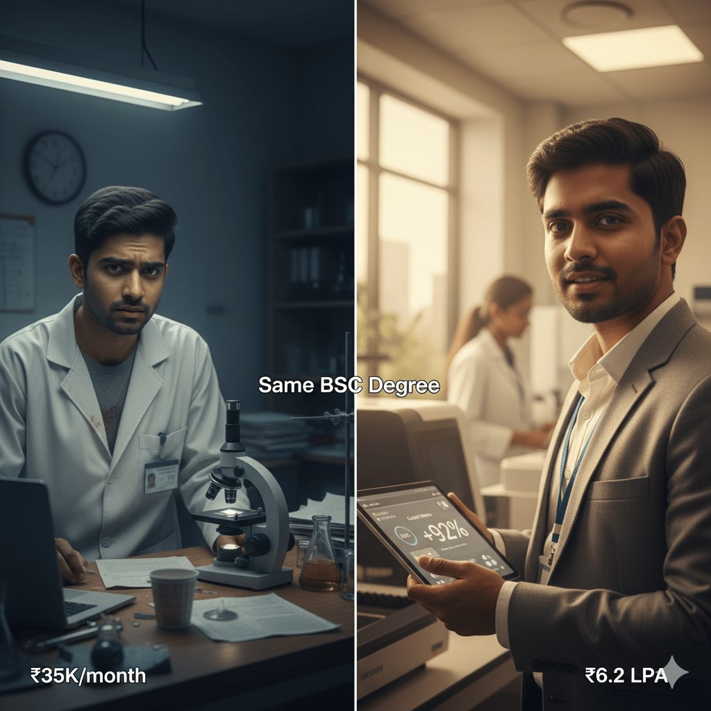 Amit scrolls LinkedIn at 11 PM. His classmate posts: 'Joined Biocon as Quality Analyst—₹6.2 LPA.' Amit's options? PhD stipend at ₹35,000/month or lab technician at ₹18,000. WhatsApp from home: 'Beta, when will you start earning properly?'